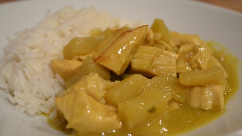 Gemüsebrühe kochen und das Hähnchen, die Zwiebel und den Apfel damit übergießen. Zugedeckt weiter ca. 15 – 20 Minuten dünsten (am besten an der Bissfestigkeit des Apfels prüfen!).