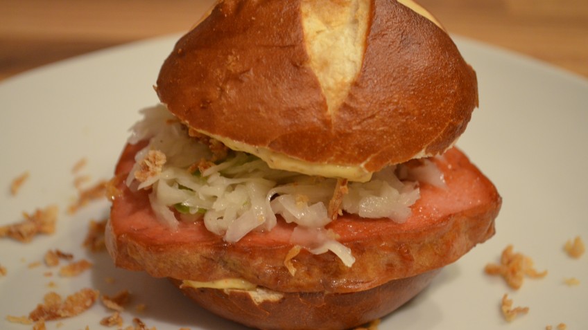 Die Laugenbrötchen in zwei Hälften schneiden. Sollten tiefgefrorene Brötchen verwendet werden, diese kurz aufbacken (nicht fertig backen).