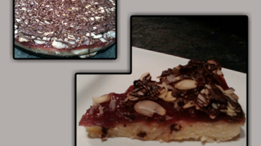 Wer möchte kann gehobelte Mandeln auf der Torte verteilen und mit der geschmolzenen Kuvertüre mit Hilfe einer Gabel besprenkeln.