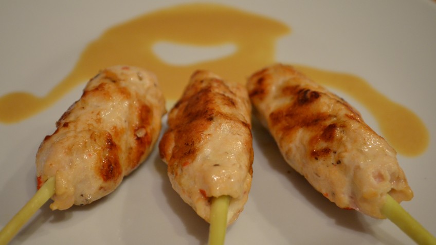 Fleischmasse portionieren und um die dickere Seite des Zitronengrases fest drücken.