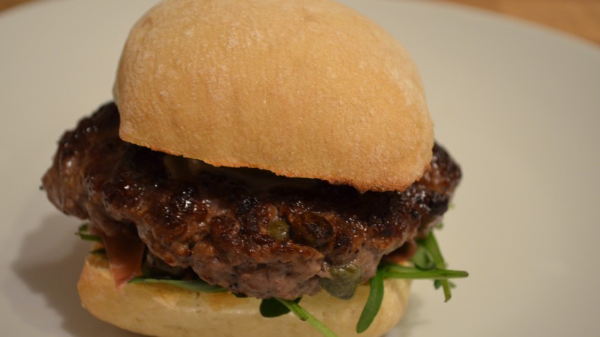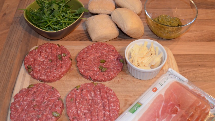 Den fertig gebratenen, heißen Patty auf den Schinken der unteren Ciabatta-Hälfte legen und mit der oberen Hälfte abdecken.