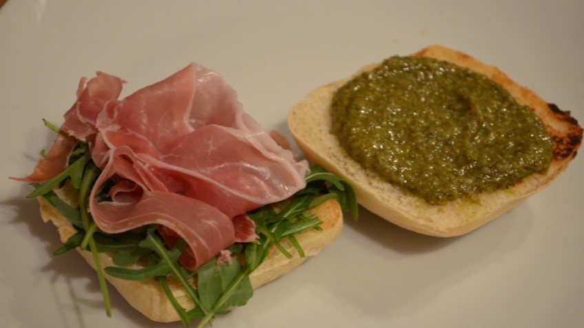 Die untere Ciabatta-Hälfte mit Rucola und je 1 Scheibe Parmaschinken belegen.