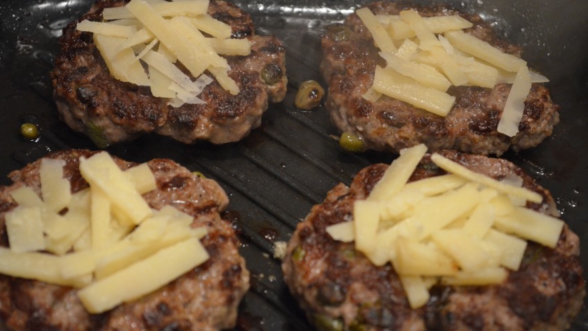 Nach dem Wenden Parmesan auf die Pattys legen.