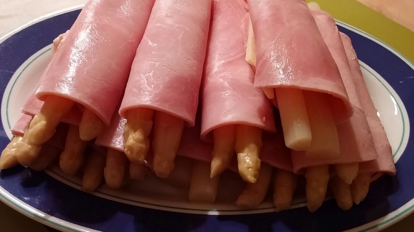 2 Stangen Spargel darauf legen und zu einer Rolle rollen.