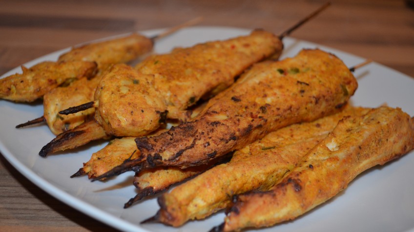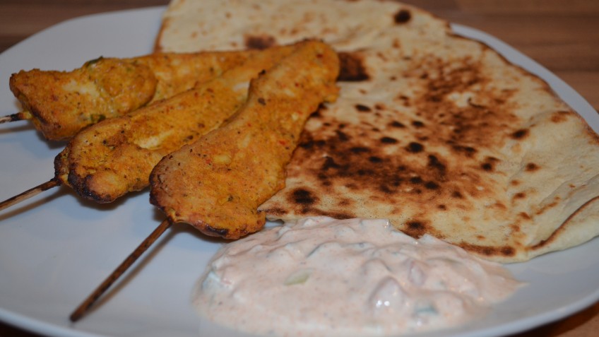 TIPP: Dazu passt ein frischer Joghurt-Dip (hier der Link) und indisches Naan Brot (hier der Link). Die Spieße vor dem Backen in Wasser einlegen, damit diese nicht verbrennen.