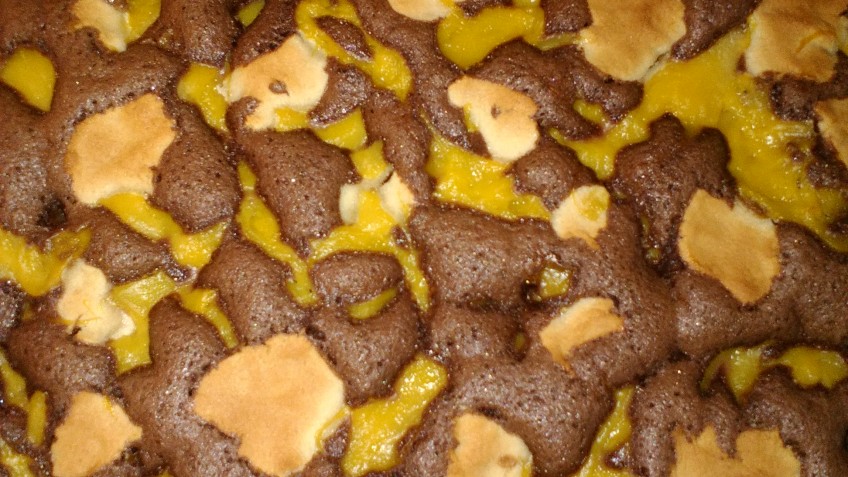 3. Statt Kuvertüre 1/2 Pck. Vanillezucker auf den heißen Kuchen verteilen.