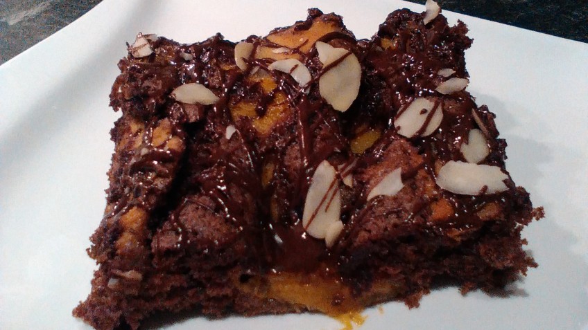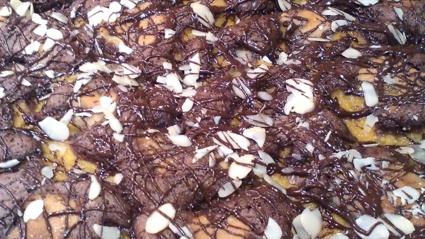 Den fertigen Kuchen auskühlen lassen und mit den Mandeln und der geschmolzenen Kuvertüre dekorieren.
